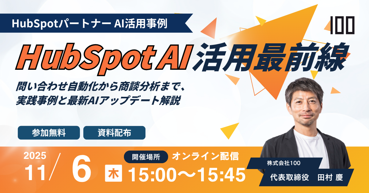 株式会社100は、HubSpotパートナーとして、自社およびクライアントの現場で実際にHubSpot AIを活用した施策を実施してきました。本ウェビナーでは、最新のHubSpot AIの機能解説に加え、株式会社100が現場で行っている具体的な活用事例をご紹介します。問い合わせ対応ワークフローの自動化やAIによる商談分析など、すぐに取り入れられるノウハウをお持ち帰りいただけます。