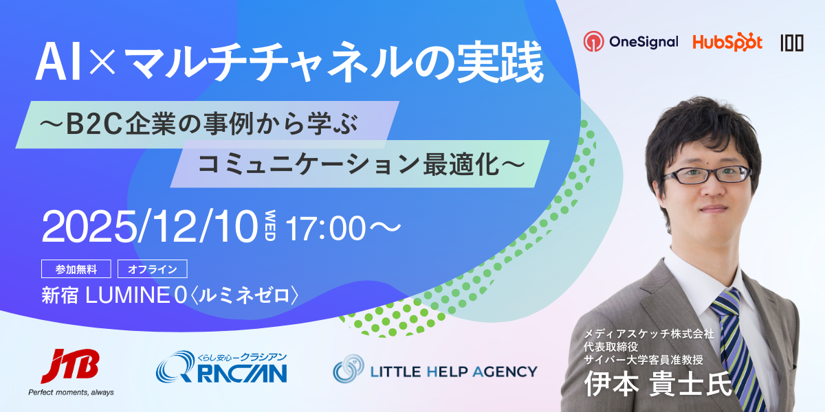 株式会社100とOneSignalは、HubSpotと連携したマルチチャネル戦略の実践を支援しており、本イベントでは、B2C領域で先進的な取り組みを行う企業と共に「AI×マルチチャネル」の可能性を探ります。